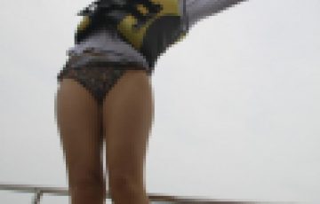 水着の日焼け跡が残る小麦色の肌。